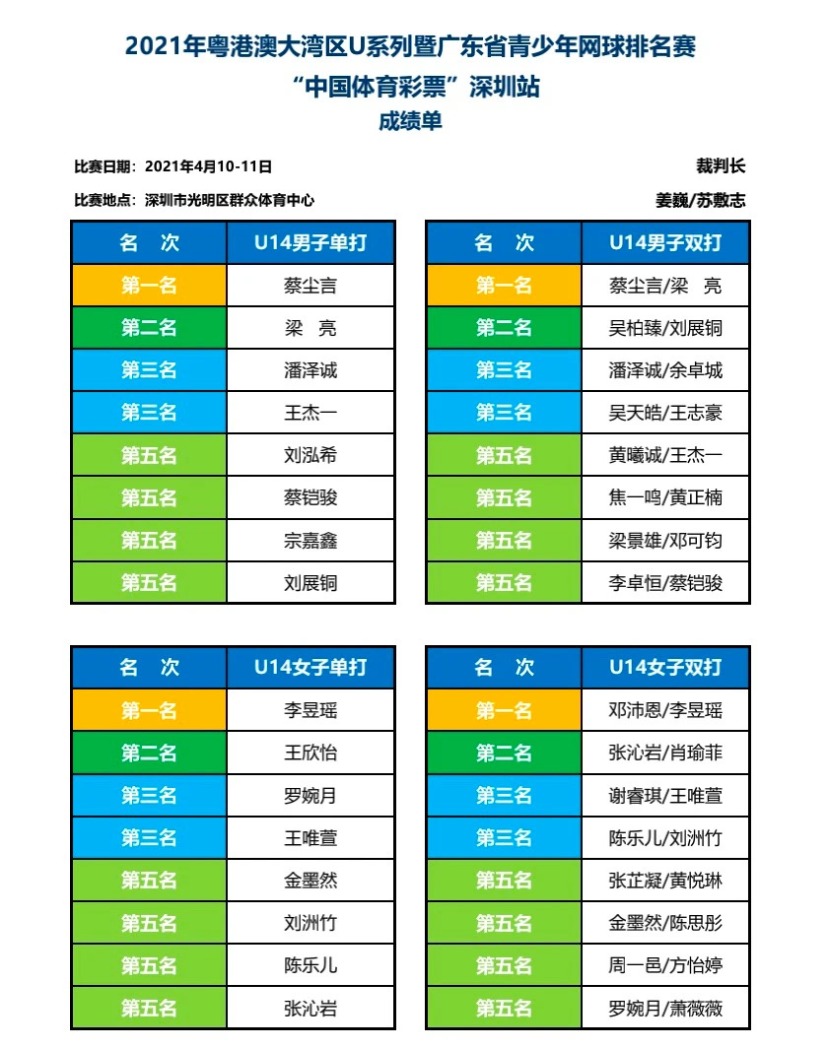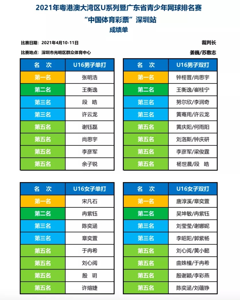 4 月 11 日, 2021 年粤港澳大湾区 U 系列暨广东省青少年网球排名赛 “ 中国体育彩票 ” (深圳站)在光明区群众体育中心圆满收官。本站比赛设置 U14 、 U16 两个组别,男、女子单、双打共 8 个小项,来自全省各地的 158 名青少年网球选手参加比赛。经过 2 天 211 场比赛的激烈角逐,各项冠军相继出炉。