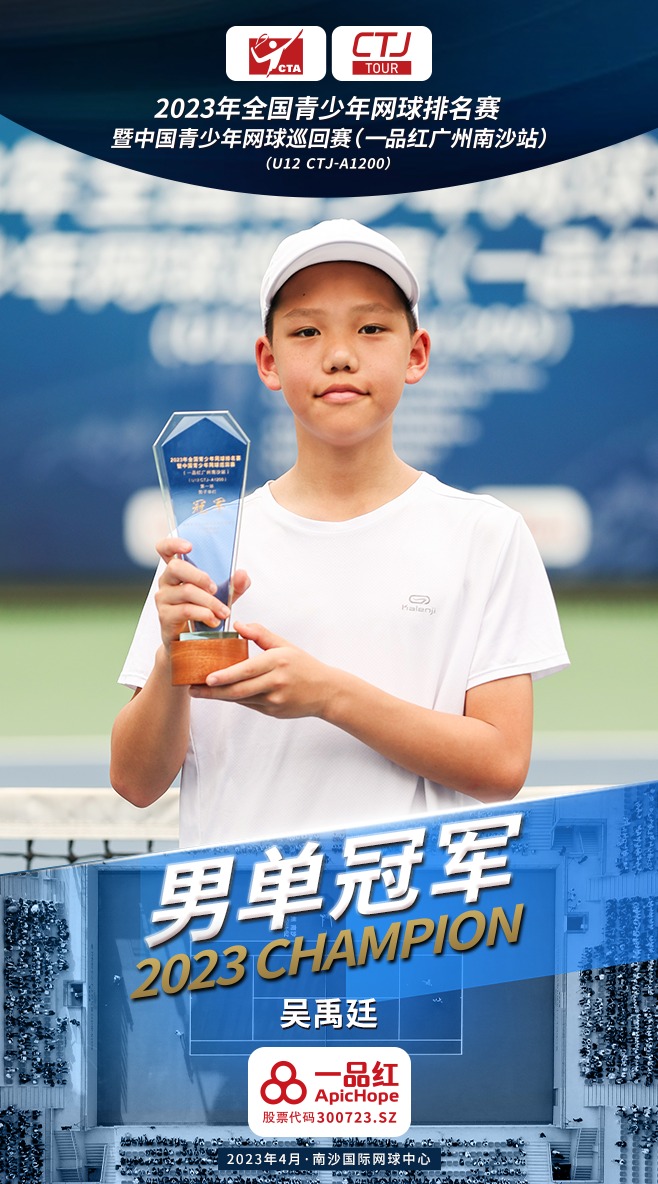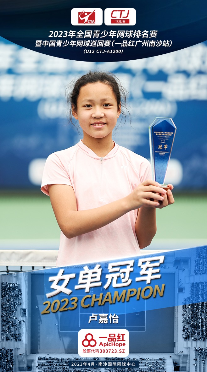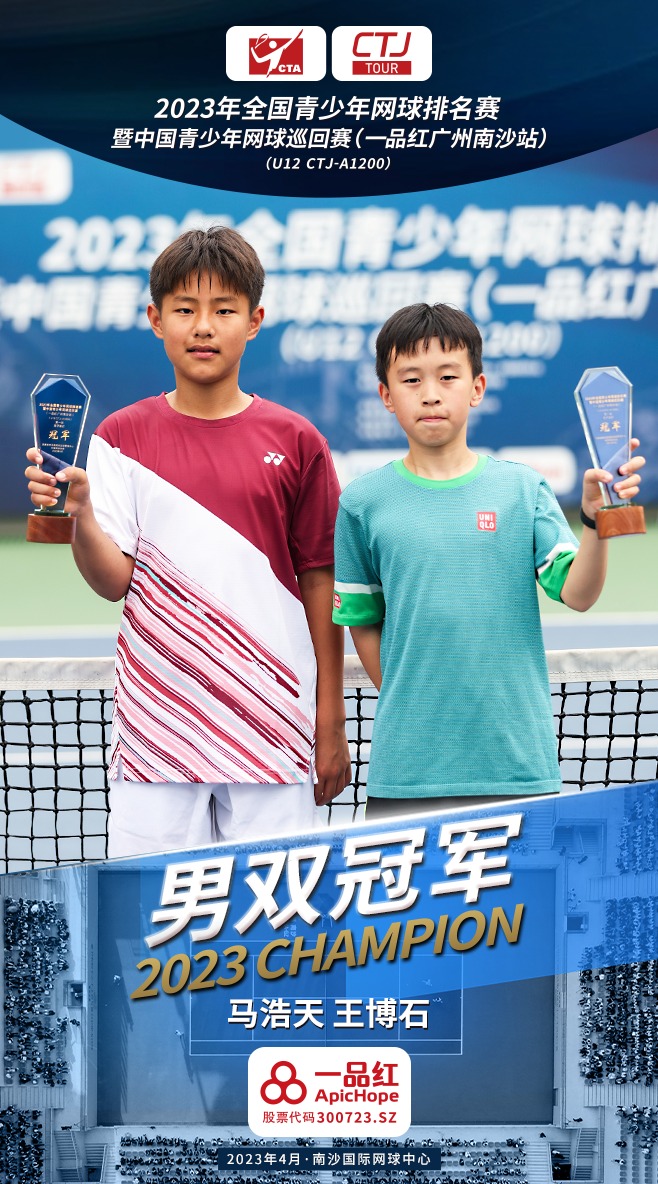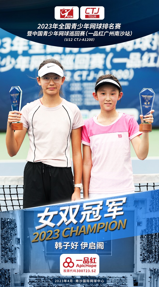 另外,男双冠军归属头号种子马浩天和王博石,而在女单决赛落败的韩子好,则搭档伊启阁获得了女双的冠军。本次2023年全国青少年网球排名赛暨中国青少年网球巡回赛(一品红广州南沙站)属于中国青少年网球最高级别的全国性A类赛事,级别为U12 CTJ-A-1200,冠军将获得1200个积分。比赛场馆南沙国际网球中心作为国际职业赛事的举办地,其中心球场的各项硬件设施达到了国际标准,参赛小选手们也对这片场地赞不绝口,两位单打冠军吴禹廷和卢嘉怡都表示在这里打球非常舒服,球的弹跳等各方面都非常有利于选手的发挥。