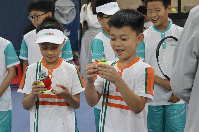 开幕式结束后,在工作人员的带领之下,19位网球小将们体验了一系列丰富多彩的趣味活动。发球测速活动激起了小将们极大的兴趣,各位小将站在底线跃跃欲试。在热身之后测速比赛正赛开始,上手发球、下手发球,每位网球小将都拼尽全力提升自己的发球时速。欧帝尔品牌方给表现出色的小将颁发了奖品,每位网球小将都收到了由ODEA网球制作的多肉盆栽小礼物。